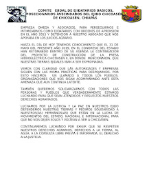 VEMOS CON CLARIDAD QUE LAS AUTORIDADES Y EMPRESAS SIGUEN CON LAS MISMA PRACTICAS PARA DESPOJARNOS. POR ESTO HACEMOS UN LLAMADO A TODOS LOS PUEBLOS, ORGANIZACIONES QUE NOS SIGAN ACOMPAÑANDO ANTE ESTA AMENAZA QUE AUN CONTINUA LATENTE.